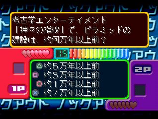 Challenge more than 16000 questions of quiz game in the main areas of "Literature/Liberal Arts" and "Socio-tech". You can choose from VS, Time Attack or Knock Out modes. In Knock Out mode, the quiz master awaits you with lots of difficult questions. Take the challenge!
